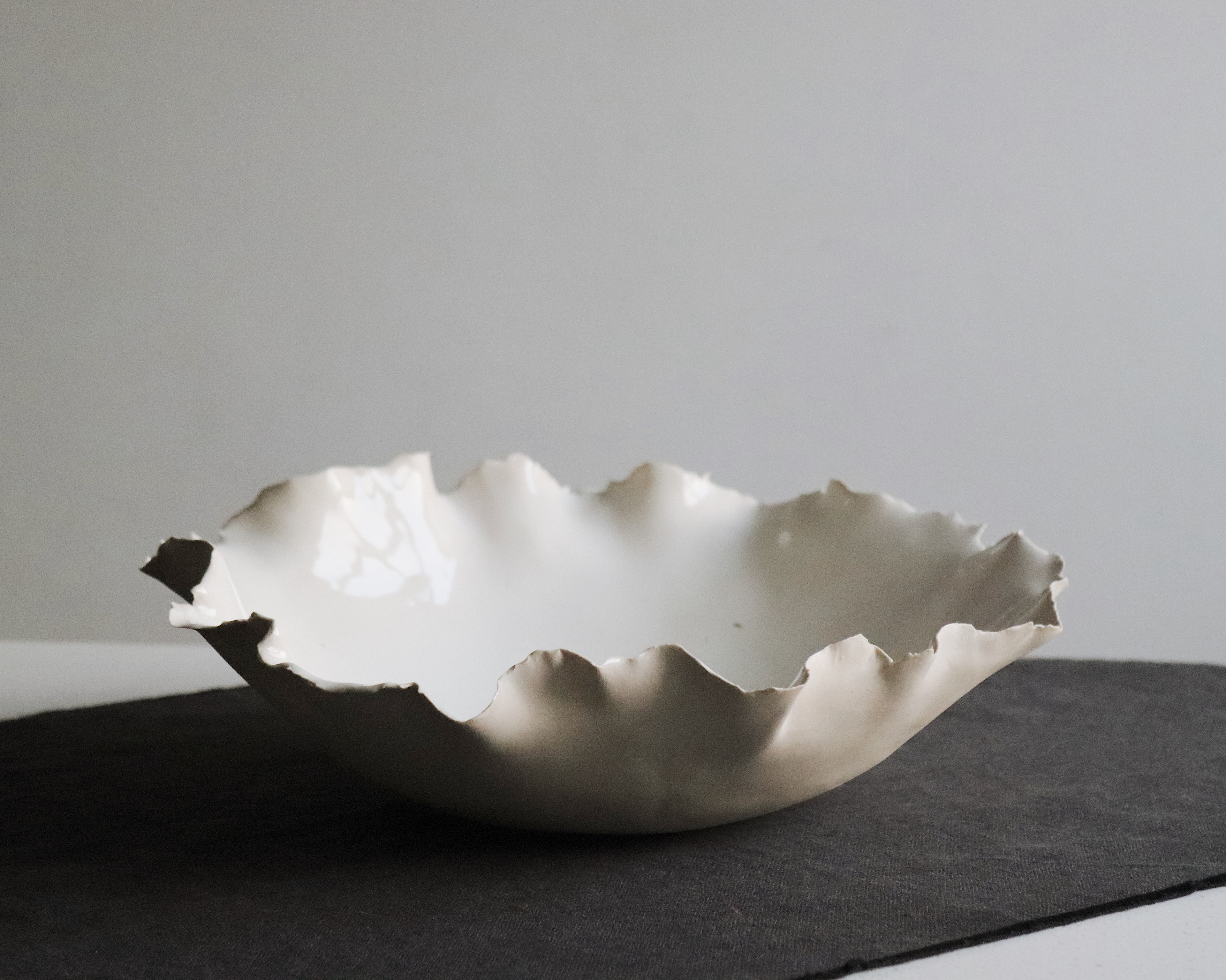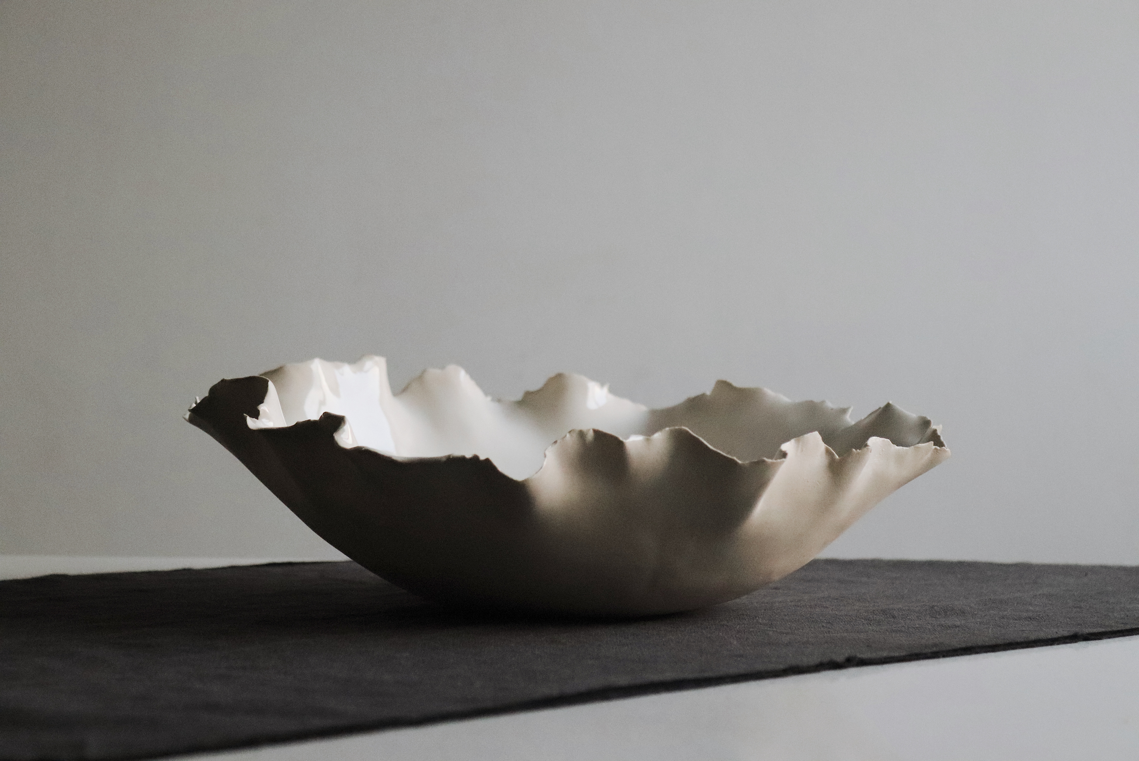 Sesión fotográfica de la fuente de cerámica gres "Ostra", de Jos Pottery. Una pieza de bordes irregulares y textura delicada, inspirada en las formas orgánicas de la naturaleza.